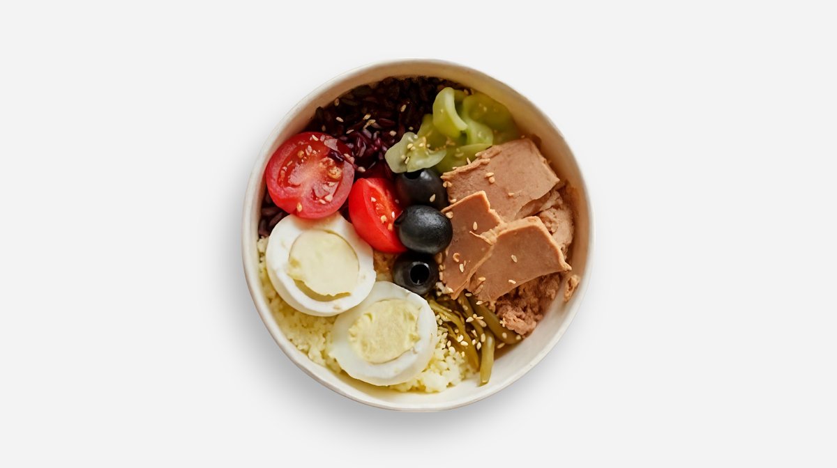 კუსკუსი, შავი ბრინჯი, კიტრი, მწვანე ლობიოს მწნილი, მოხარშული კვერცხი, ჩერი პომიდორი, ავოკადო, თინუსი, სოიოს სოუსი