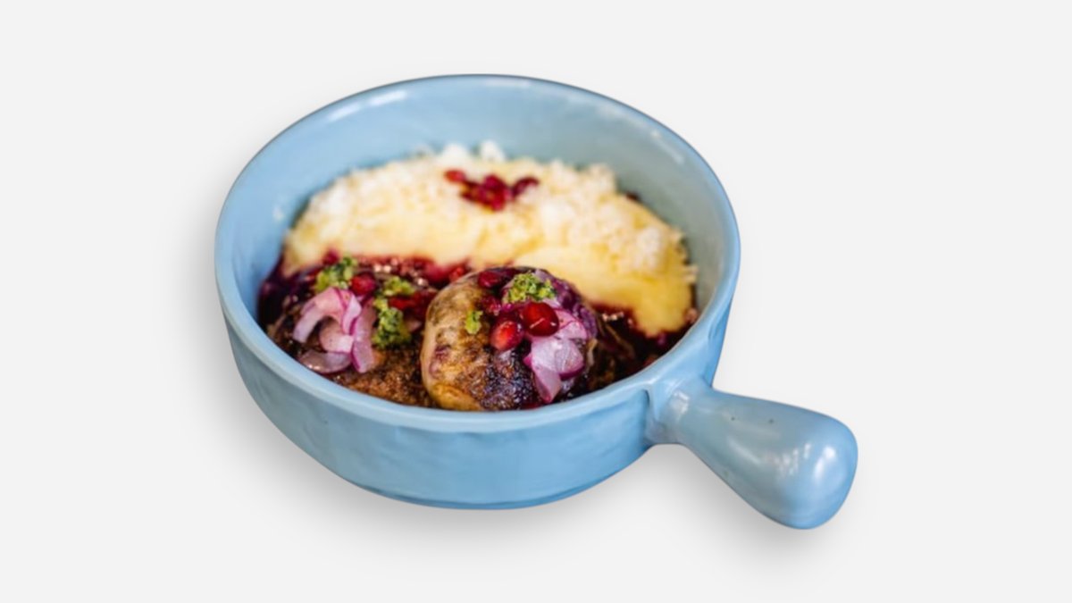 კიევური კოტლეტი, სოუსი, გამომცხვარი კარტოფილი კამით