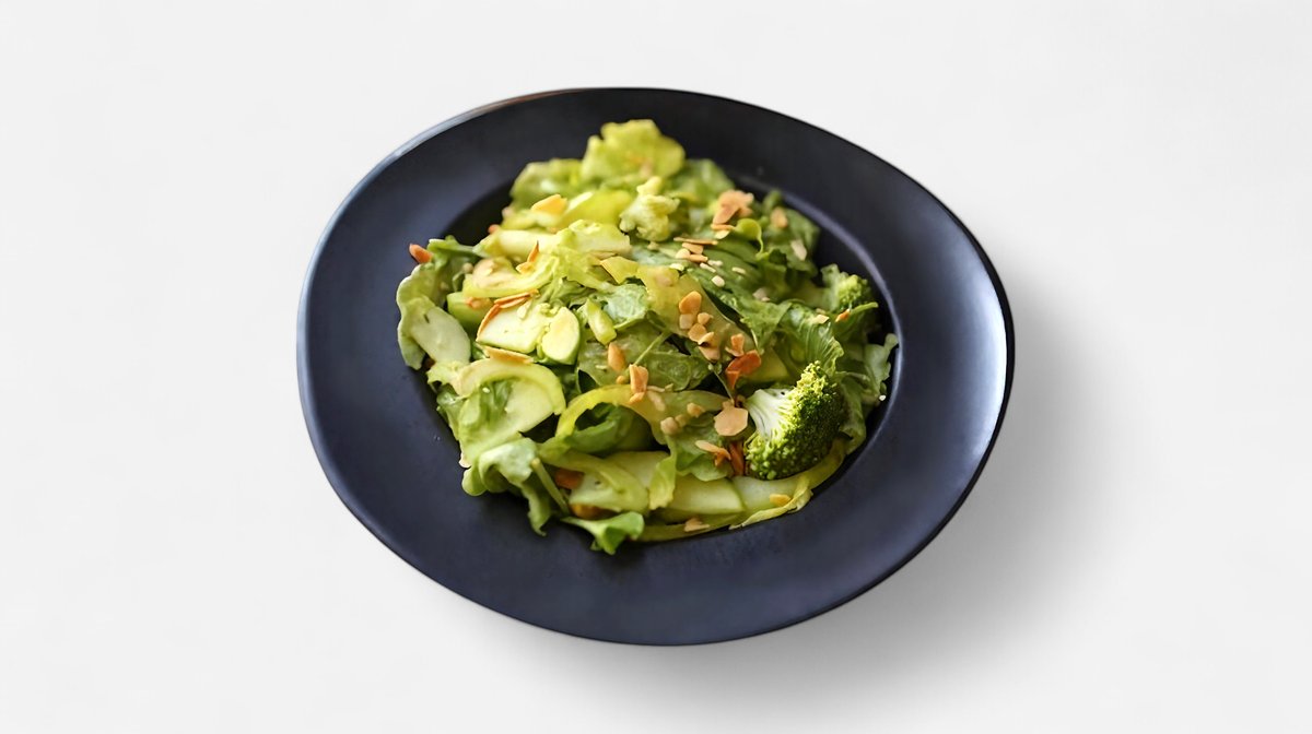 სალათის ფოთოლი,კიტრი,მწვანე ვაშლი,ავოკადო,ბროკოლი,მწვანე ბულგარული,მწვანე ხახვი,ზეითუნის ზეთი,დიჯონის მდოგვი,ტარხუნის სოუსი