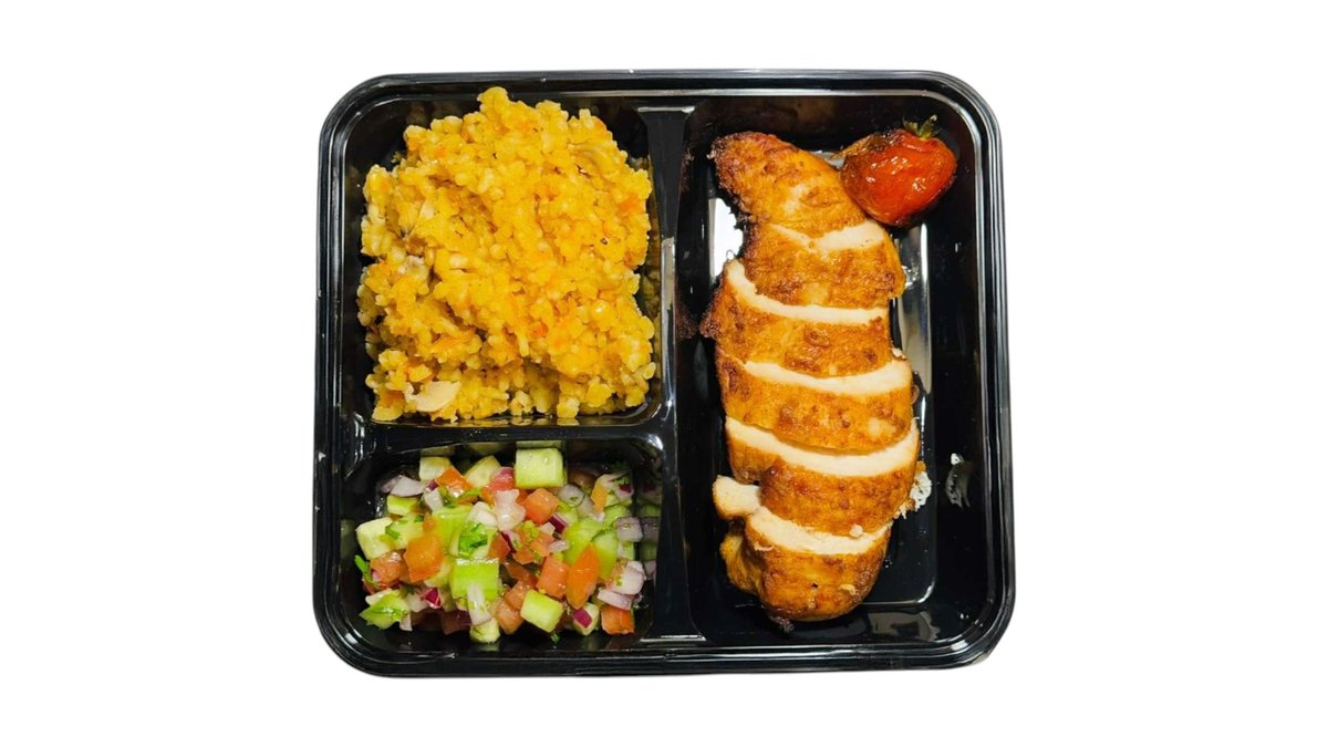 ქათმის ფილე,ბრინჯი,კიტრი,პომიდორი,ხახვი