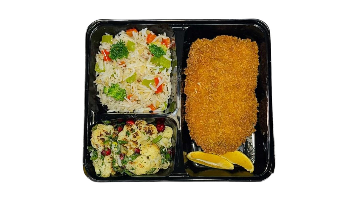 თევზი, ბრინჯი ბოსტნეულით, ყვავილოვანი კომბოსტოს სალათი, ლიმონი