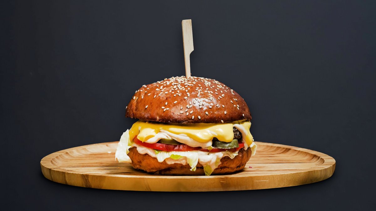 საქონლის ხორცი, სალათის ფოთოლი, მდნარი ყველის ფირფიტები, პომიდორი, ჰამბურგერის პურები.