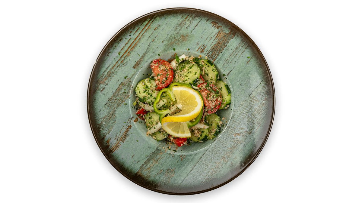 სალათის ფოთოლი,პომიდორი,კიტრი,მწვანე ხახვი,ბოლოკი,ბულგარული,ფატუშის პური