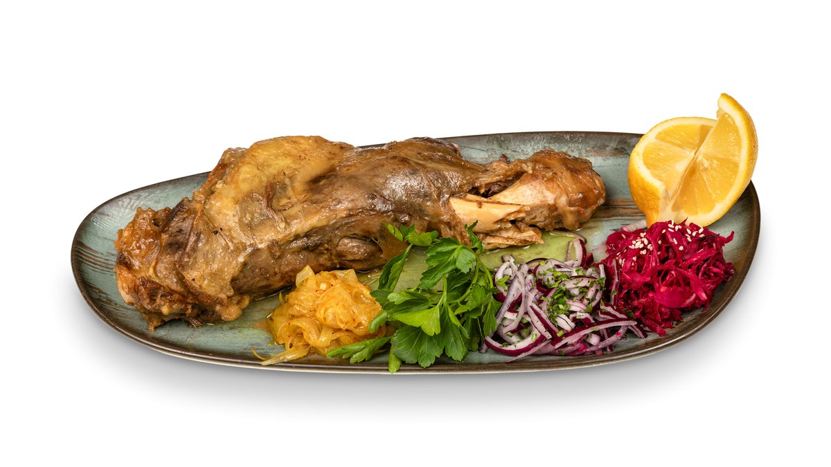 ცხვრის კანჭი ტომატის წვენით.
