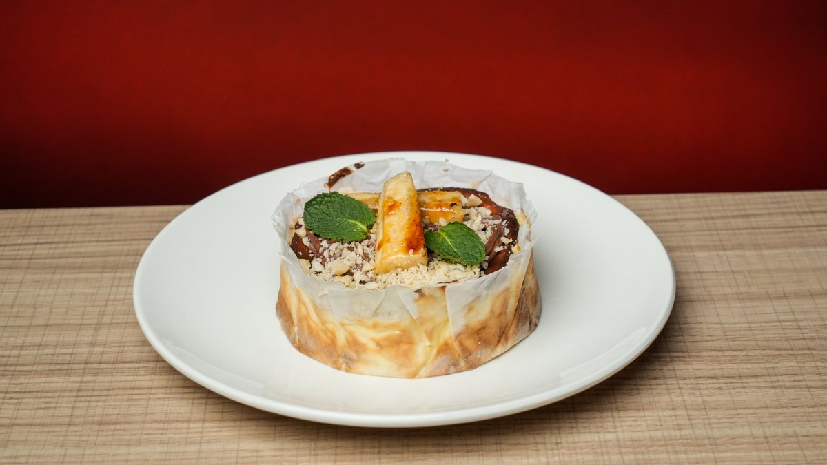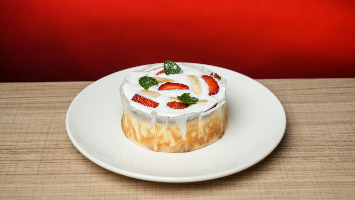 ბასკური ჩიზქეიქი თეთრი კრემით, მარწყვით და ბანანით