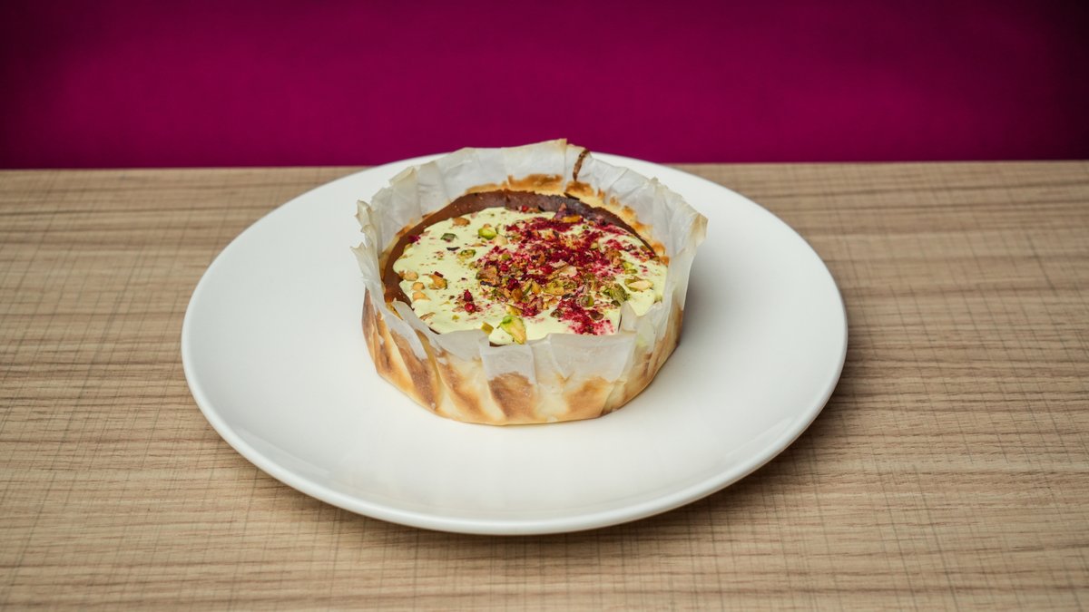 ბასკური ჩიზქეიქი ფსტის კრემითა და ჟოლოს ფანტელებით