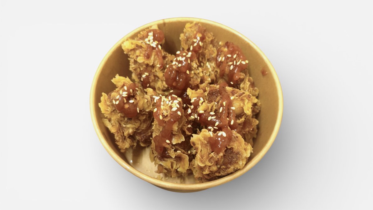 ქათმის ფრთები, ტკბილ-ცხარე სოუსი, კარტოფილი ფრი, თეთრი სოუსი
