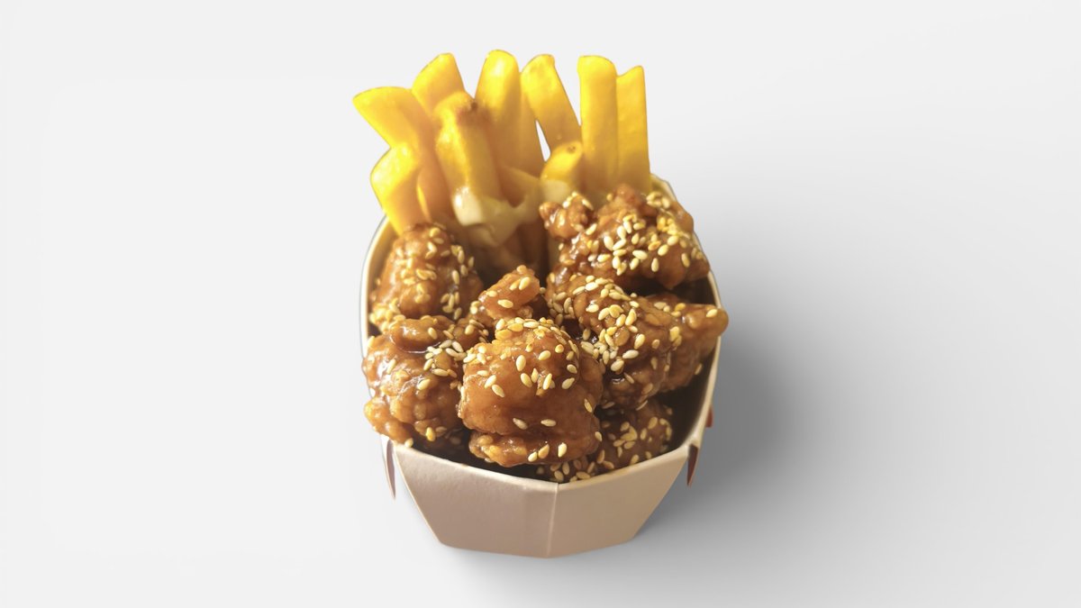 ქათამი, ტერიაკის სოუსი, სეზამის მარცვლები, კარტოფილი ფრი, თეთრი სოუსი, მწვანე ხახვი
