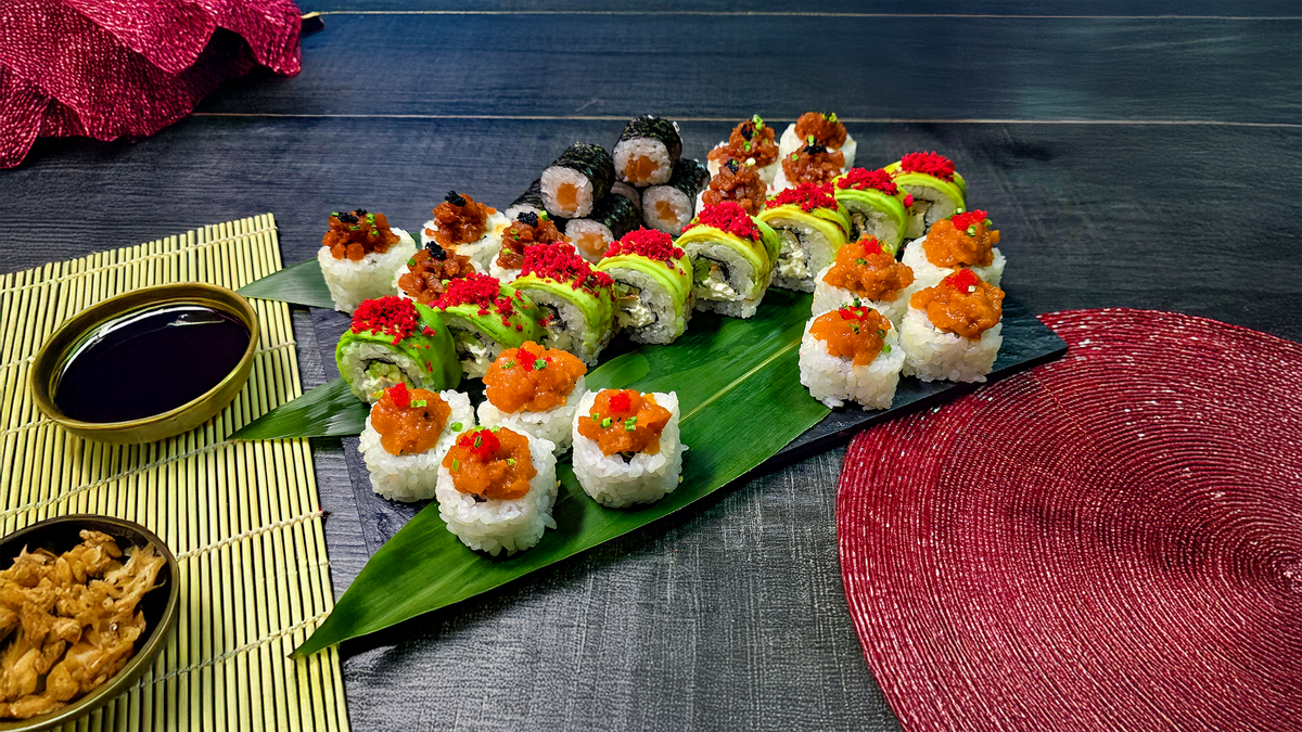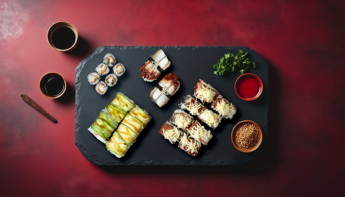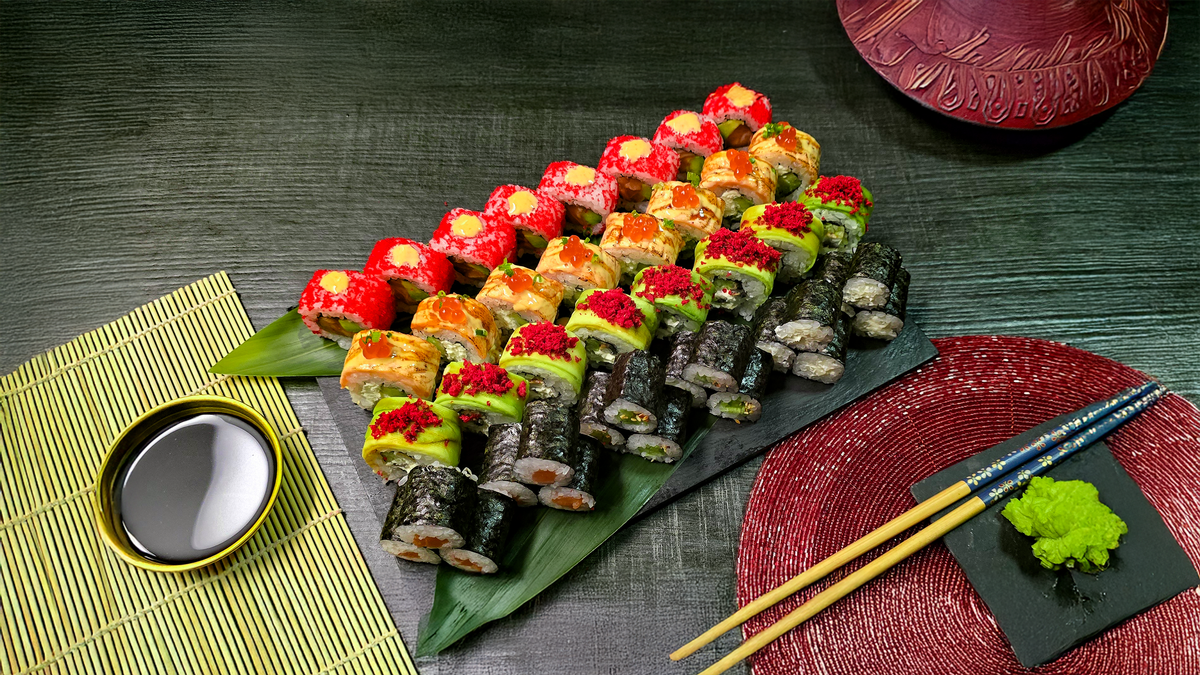 კალიფორნია კლასიკური, ფილადელფია როლი, კალიფორნია კიბორჩხალას ჩხირებით, ჩიზ როლი, ორაგულის მაკი, კიტრის მაკი, უნაგის ნიგირი, სოიოს სოუსი, ვასაბი, დამარინადებული ჯინჯერი