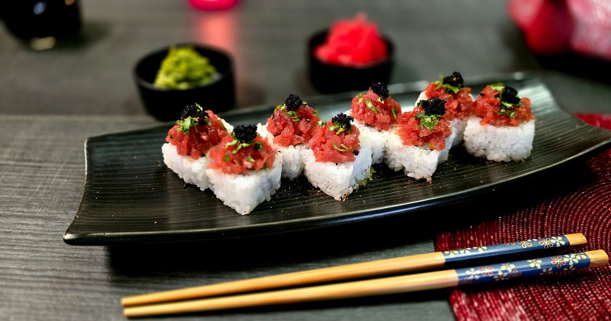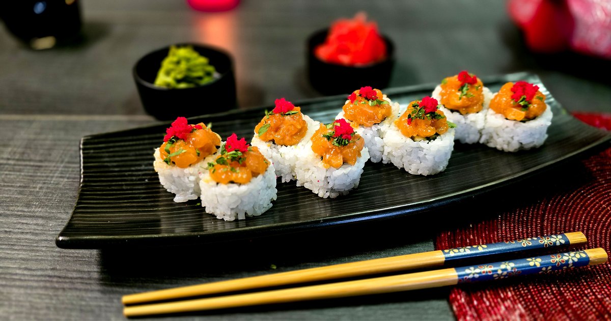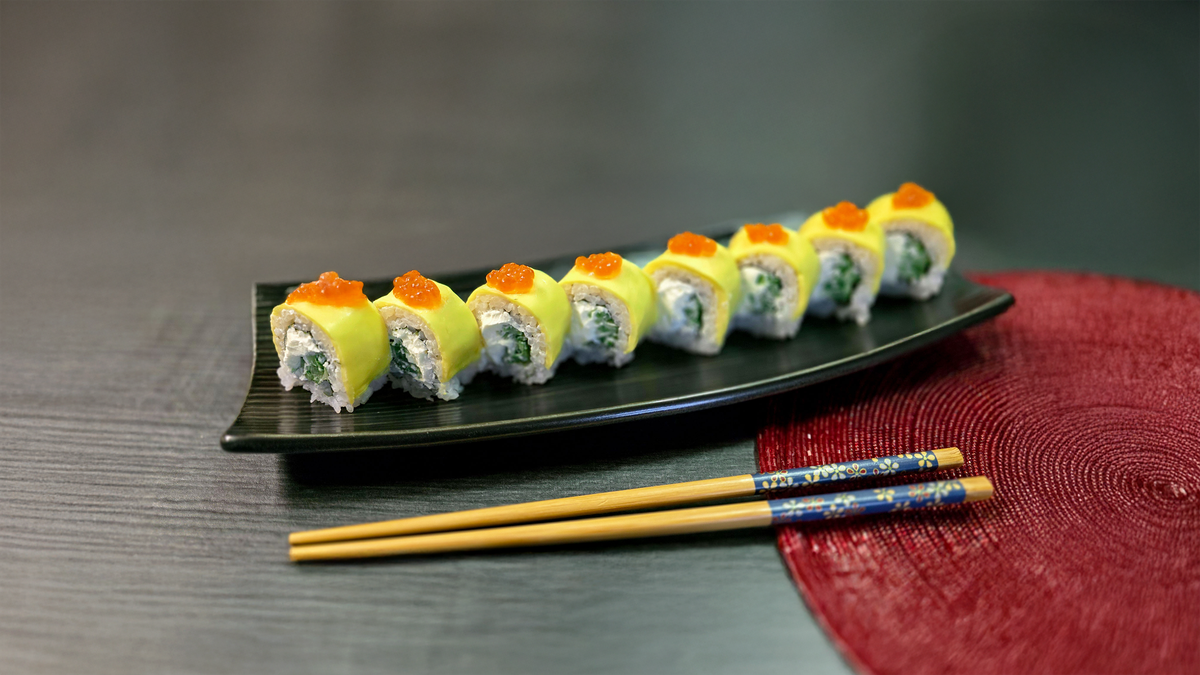 ბრინჯი, ნორი, ორაგული, ნაღების კრე-ყველი, მწვანე ხახვი, ჩედარი, მფრინავი თევზის ხიზილალა, სოუსი