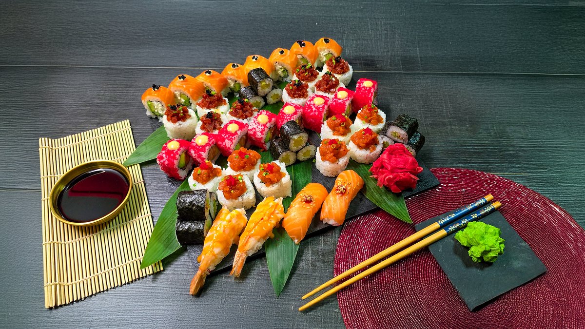 კალიფორნია კრაბით და ტობიკოთი, კალიფორნია კრაბით და სეზამით, ფილადელფია როლი, კრევეტის როლი, კაპა-ჰიაშის როლი კრევეტის ნიგირი, ორაგულის ნიგირი, თინუსის ნიგირი, გველთევზას ნიგირი, კიტრის მაკი სოიოს სოუსი ჯინჯერი, ვასაბი