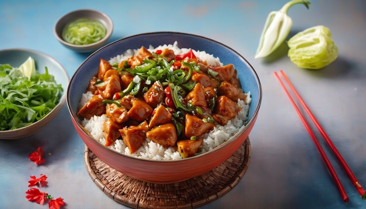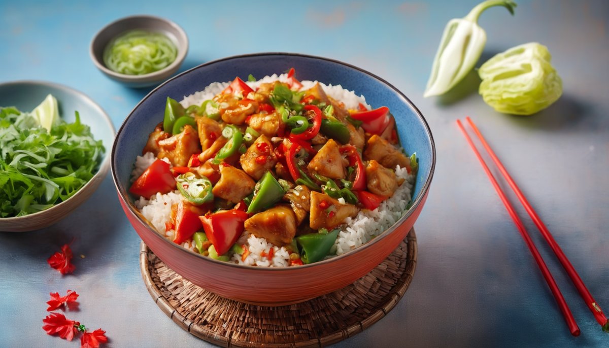 ქათამი, წიწაკა, ბრინჯი, ცოს სოუსი, მწვანე ხახვი, სეზამის მარცვლები