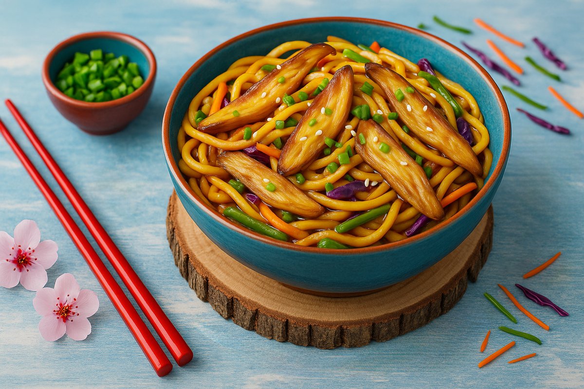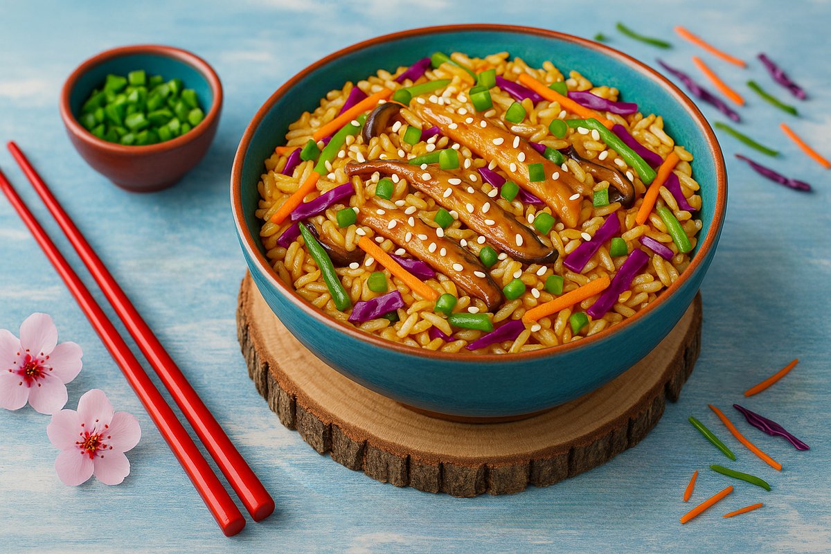 ბრინჯი, ქამა სოკო, მწვანე ხახვი, სტაფილო, მწვანე ბულგარული, წითელი და თეთრი კომბოსტო, სეზამის მარცვლები