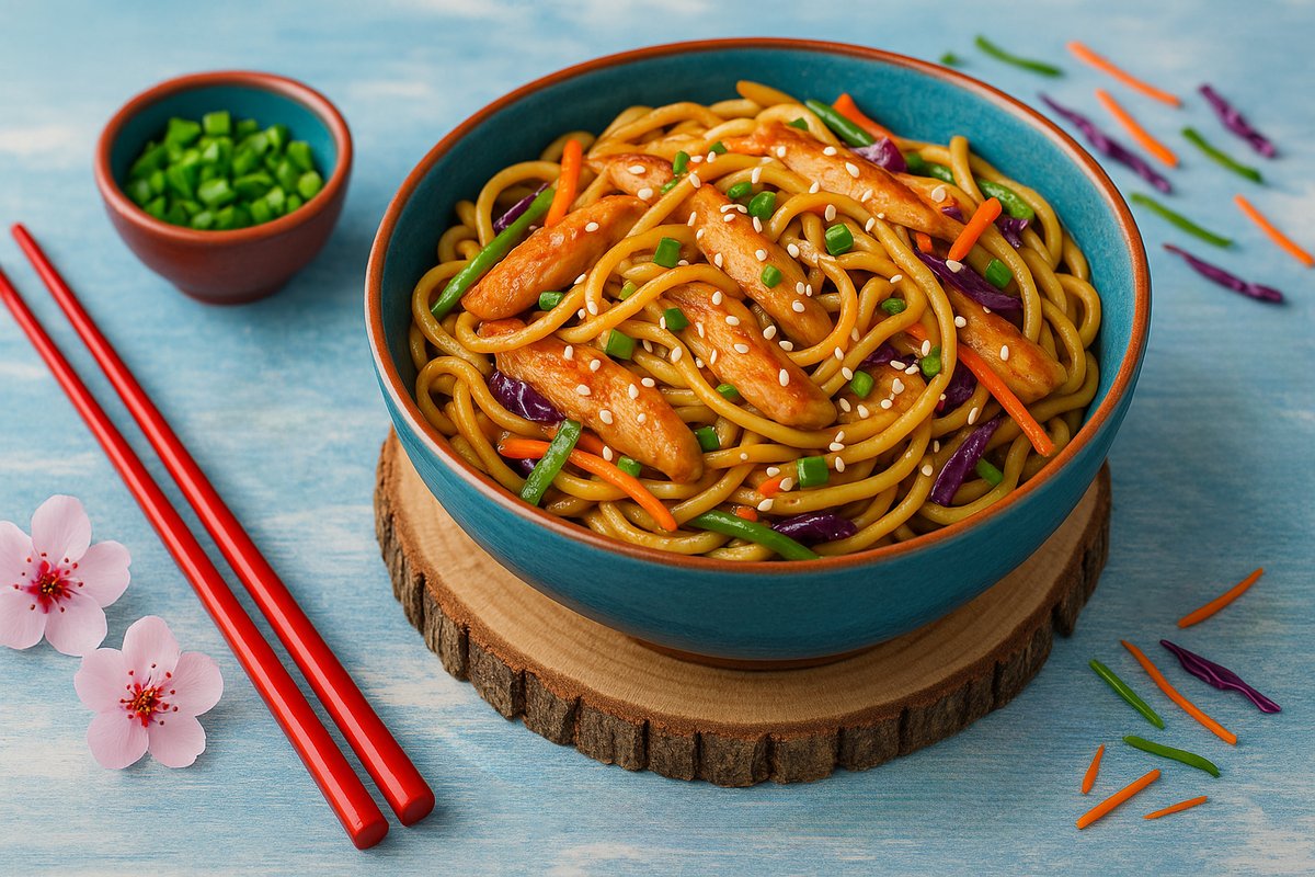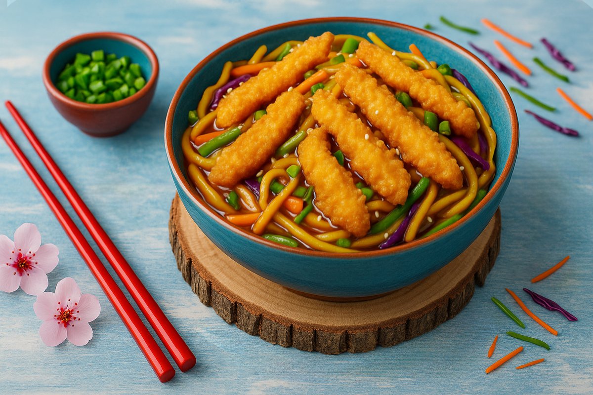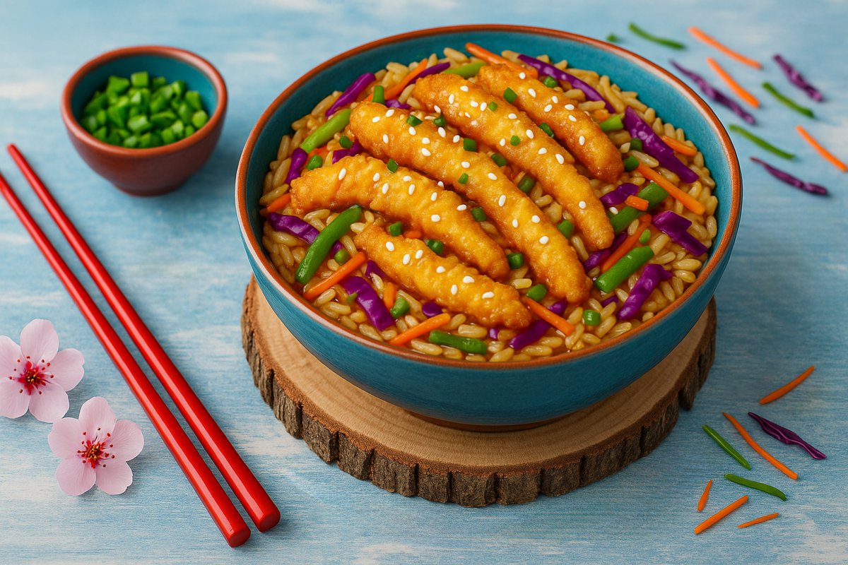 ბრინჯი, ქათმის ხორცი ტემპურაში, მწვანე ხახვი, მწვანე ბულგარული, სტაფილო, წითელი და თეთრი კომბოსტო, სეზამის მარცვლები