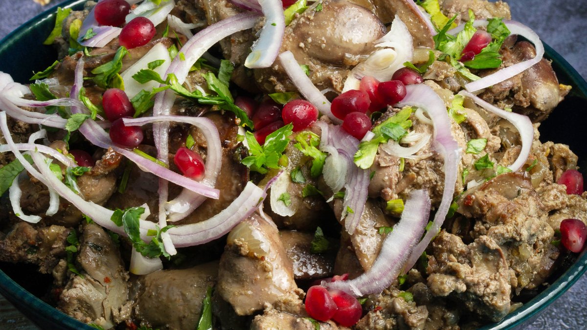 ქათმის ღვიძლი, ხახვი, მწვანილები, სანელებლები