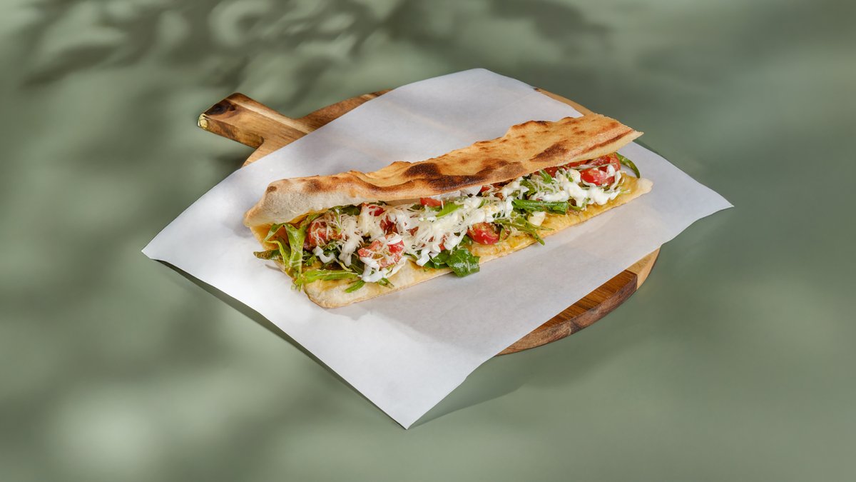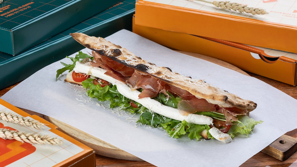 კრემ ყველი, მოცარელა, ცოცხალი პომიდორი, ინდაურის მორტადელა, სალათის ფოთოლი, ზეითუნის ზეთი, ფოსტა, პარმეზანი