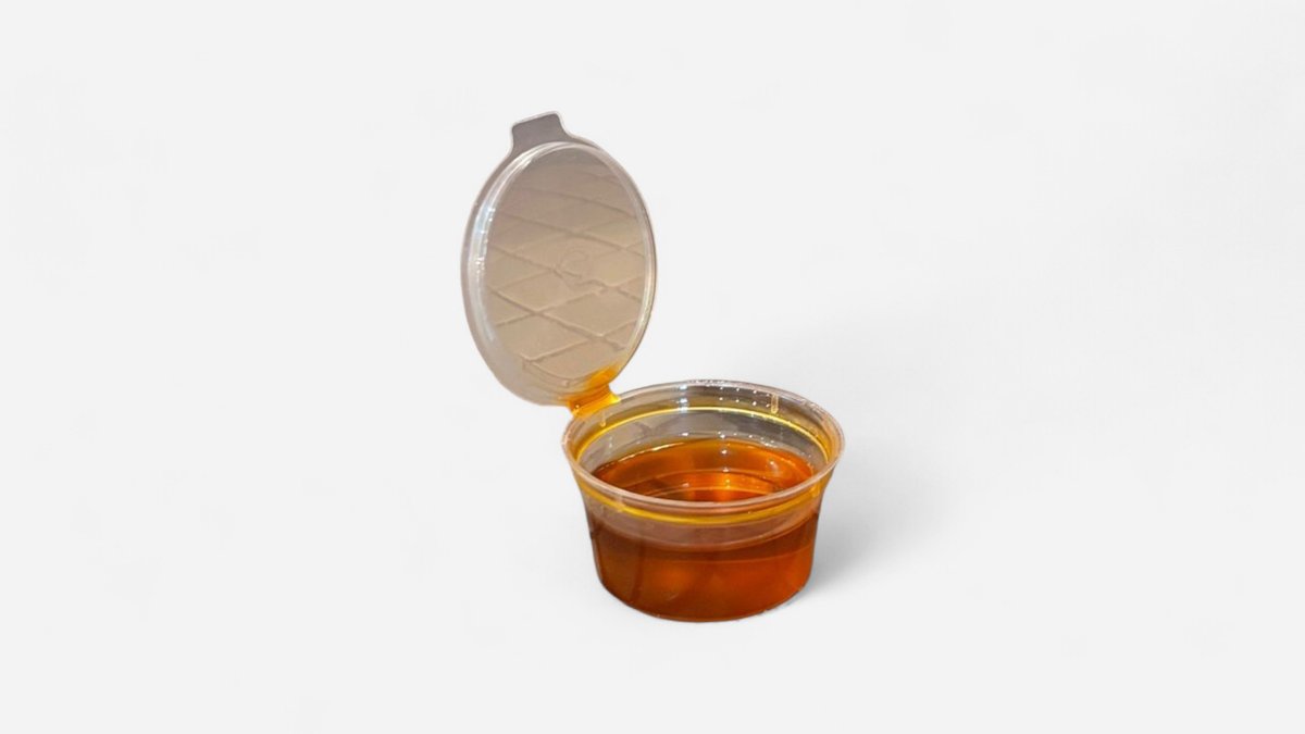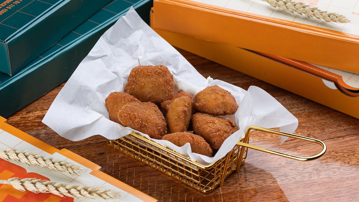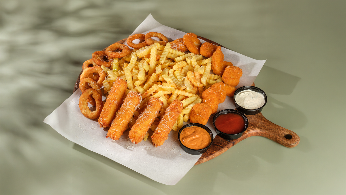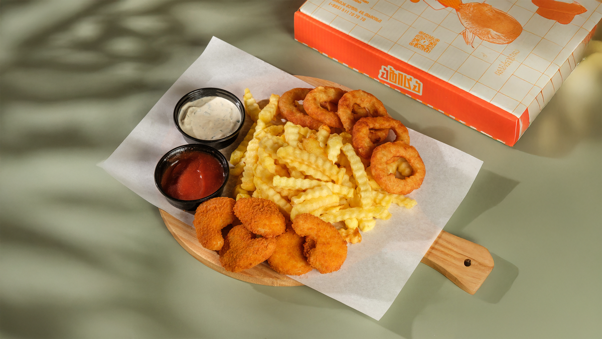 ხახვის რგოლი 5ც, ქათმის ნაგეთსი 5ც, კარტოფილი ფრი, კეჩუპი და ნივრიანი სოუსი.