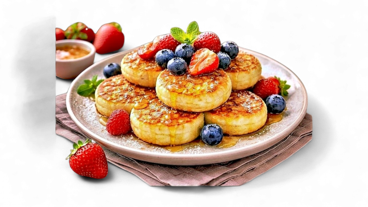 Traditional cottage cheese pancakes, golden and crispy on the outside, soft and tender on the inside. Lightly sweetened and served warm with sour cream, honey, or fresh berries for a perfectly balanced, comforting taste. A classic Eastern European favorite made with love