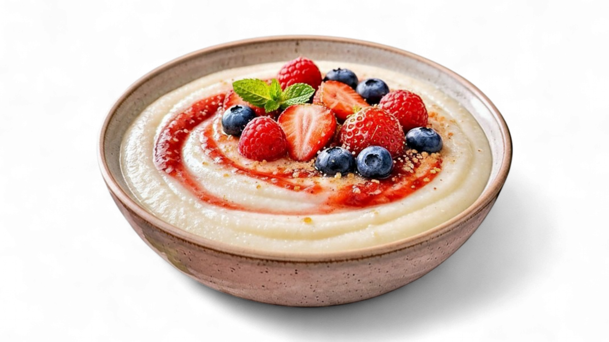 Creamy semolina porridge cooked in milk until smooth and velvety. Gently sweetened and served warm with butter or berry sauce for a comforting, classic breakfast.