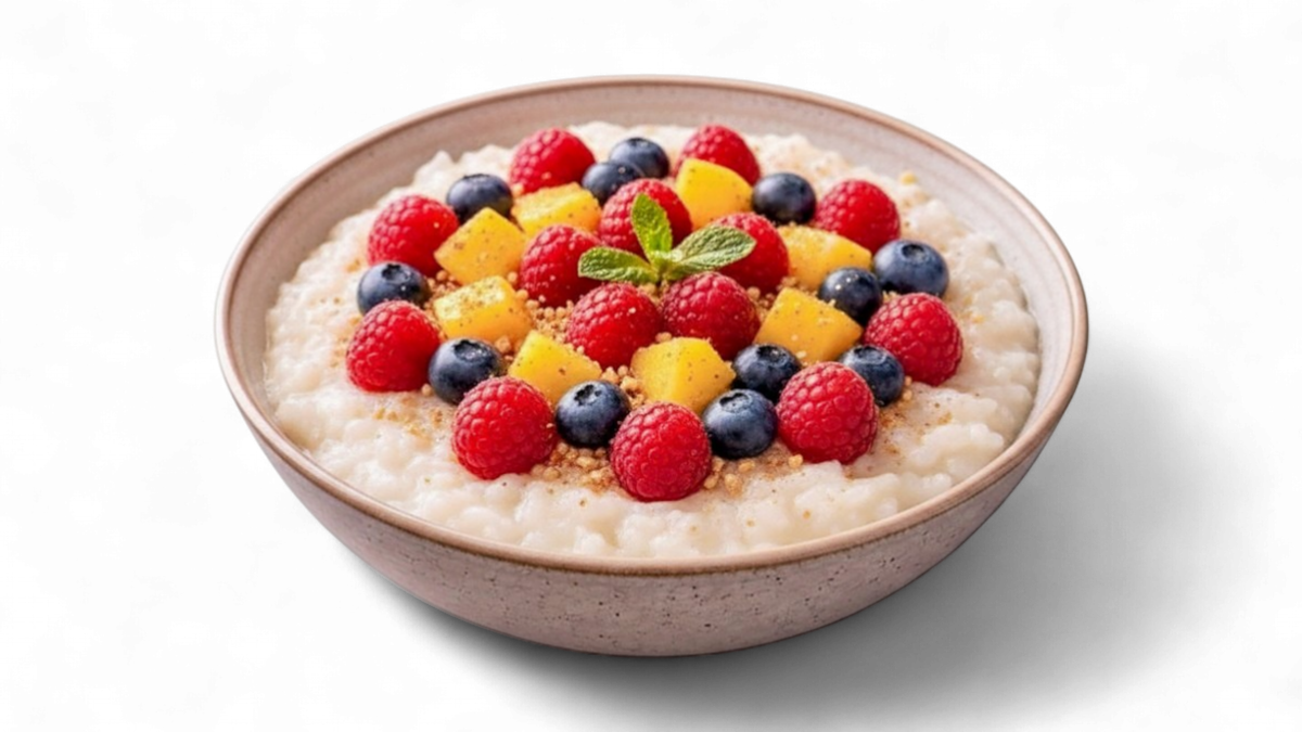Creamy rice porridge cooked in milk until tender and smooth. Lightly sweetened and served warm with butter or fresh fruit for a gentle, comforting start to your day.