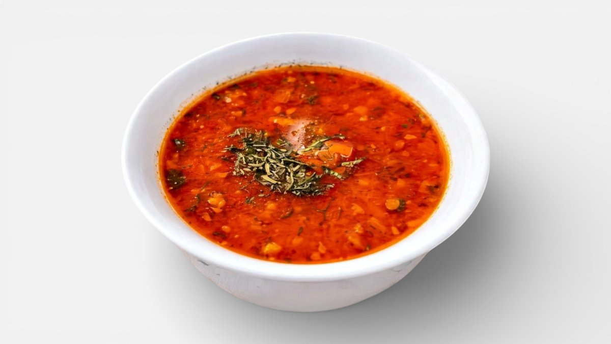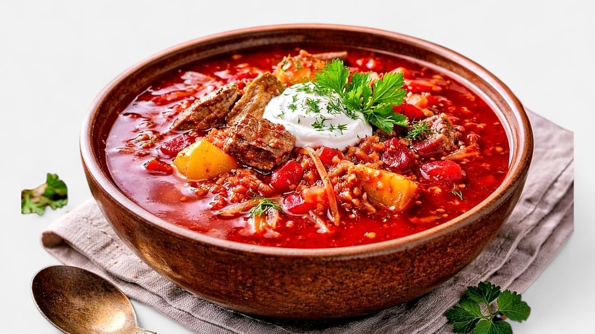Traditional beet soup slow-simmered with tender meat, cabbage, potatoes, and vegetables. Rich, hearty, and full of flavor, served hot with fresh herbs and a dollop of sour cream.