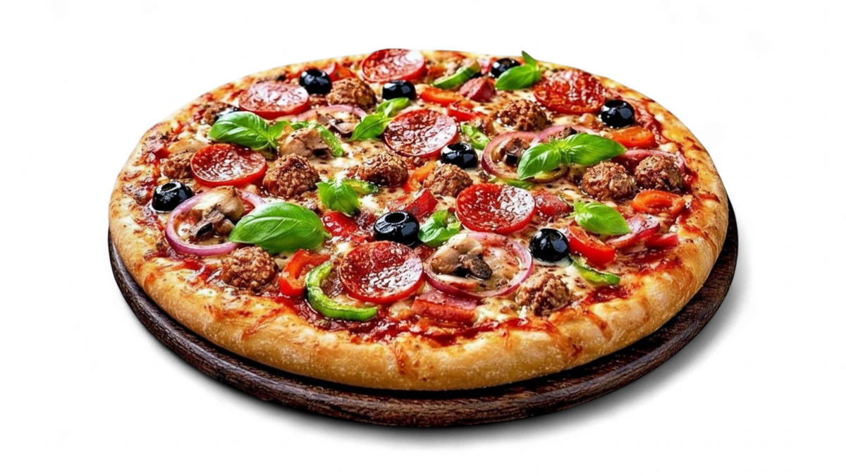 A golden, crispy pizza topped with a mix of fresh ingredients and rich flavors. Perfect for sharing.