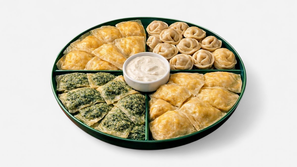 Assorted handmade dumplings with a variety of savory fillings. Served hot with butter or sour cream, offering a delicious mix of flavors in one comforting dish. 2 person