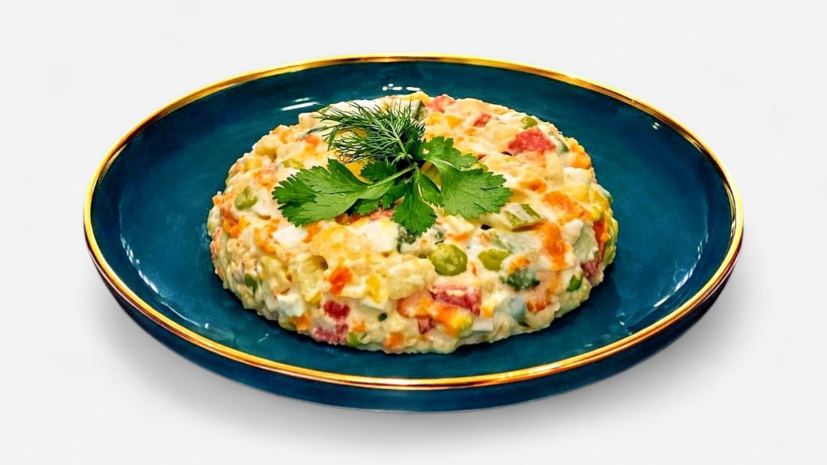 Olivier salad (also known as Russian salad) is a iconic, festive dish, essential for New Year celebrations. It consists of finely diced boiled potatoes, carrots, pickles, eggs, peas, and bologna sausage (or chicken), generously tossed in mayonnaise