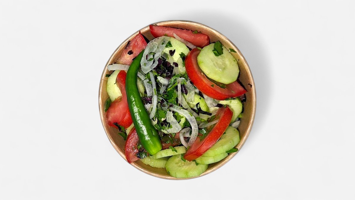 კიტრი/პომიდვრის სალათი , ხახვთან და მწვანილთან ერთად. მარილი სტანდარტულად .