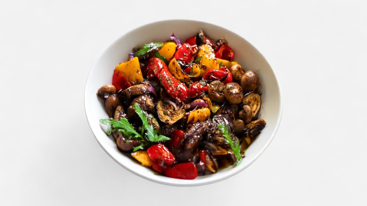 მაყალზე შემწვარი პომიდორი, ყაბაყი, წითელი და მწვანე ბულგარული წიწაკა, სოკო , ცხარე მწვანე წიწაკა .