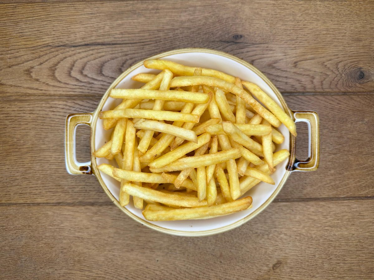 ქათმის ხორცი,კარტოფილი ფრი,მდოგვი,ქინძი,ნიორი,კვერცხი,ფქვილი,პანკო Chicken, French fries, Mustard, Cilantro, Garlic, Egg, Flour, Panko breadcrumbs.