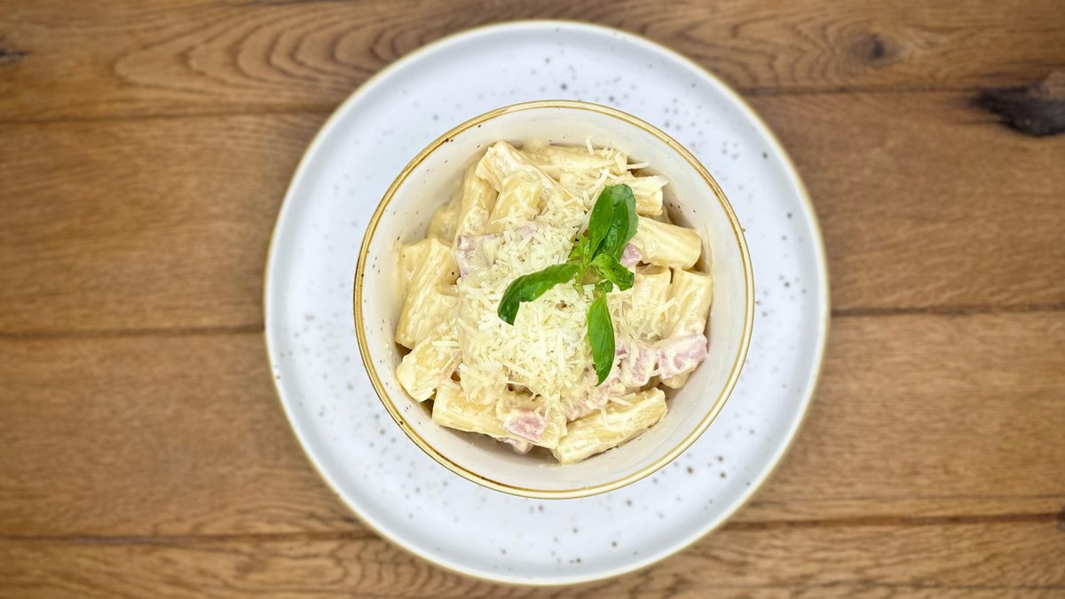 პასტა,მოცარელა,ნაღები,ბეკონი,მარილი,კვერცხი mozzarella cheese, cream, bacon, salt.