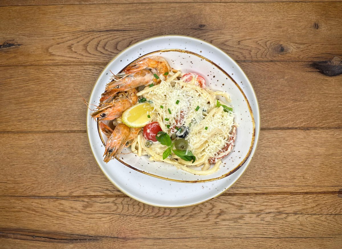 კრევეტები,პომიდორი,ნიორი,პაპრიკა,პარმეზანი,ნაღები,ზეითუნის ზეთი Shrimp, tomato, garlic, paprika, parmesan, cream, olive oil.