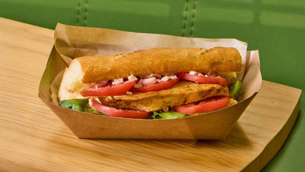 ქათმის ფილე, პომიდორი, სპეც სოუსი, სალათი, სუნელი, ბაგეტის პური