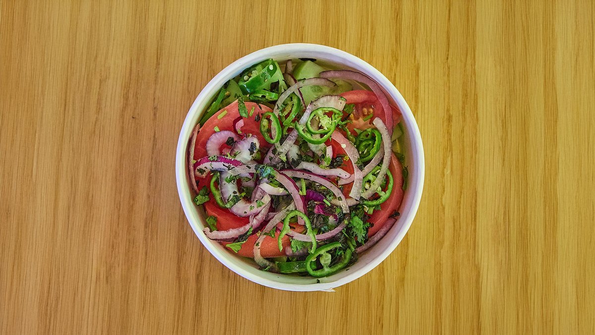 კიტრი, პომიდორი, ხახვი, მწვანილი, მარილი,წიწაკა