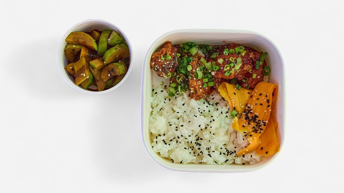ქათმის ხორცი,ბრინჯი,ტკბილ ცხარე სოუსი,კიტრის მარინადი,მწვანე ხახვი,სოიოს სოუსი,სეზამის მარცვალი,მწვანე ხახვი,სეზამის ზეთი,კორეული წიწაკის პასტა.