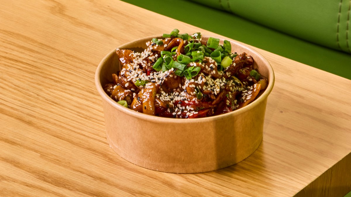 ფეტუჩინის ლაფშა, ნედლი ქათმის ხორცი, სოიოს სოუსი, ვორჩესტერის სოუსი, მარილი, ბოსტნეული, ხახვი მწვანე, სეზამის მარცვალი