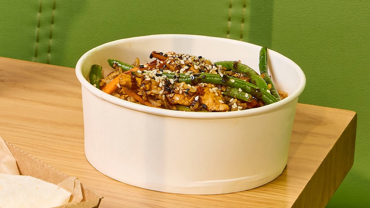 ბრინჯი ბასმათი, ქათმის ხორცი, ბოსტნეული, სუნელები, მწვანილი, მარილი, ცხარე სოუსი