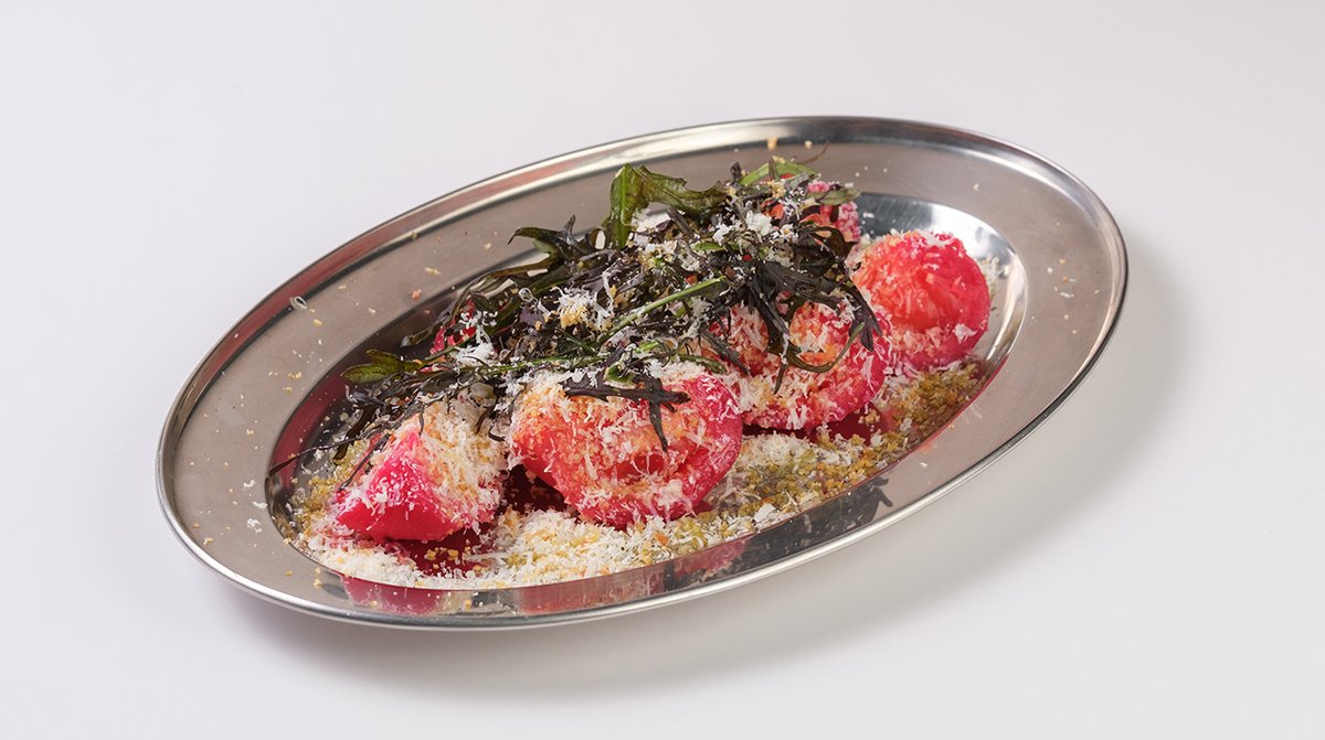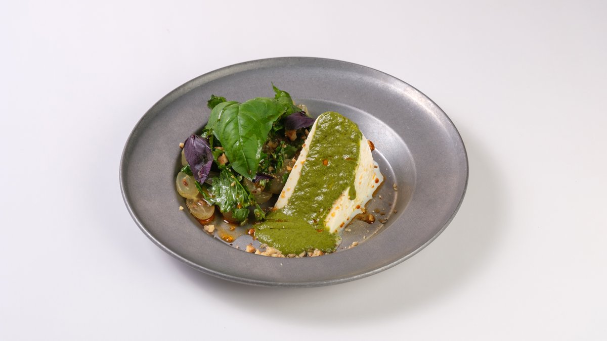 სულგუნი, მწვანე პესტო, ყურძენი, თხილი, ცხარე ზეთი