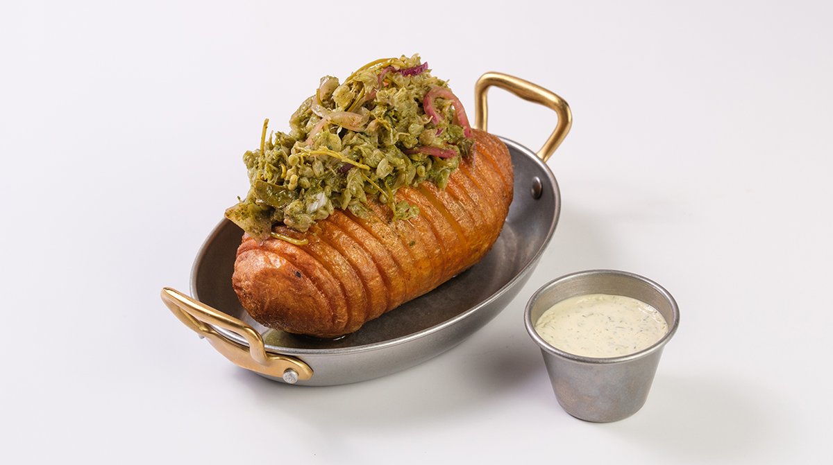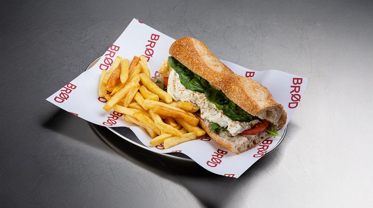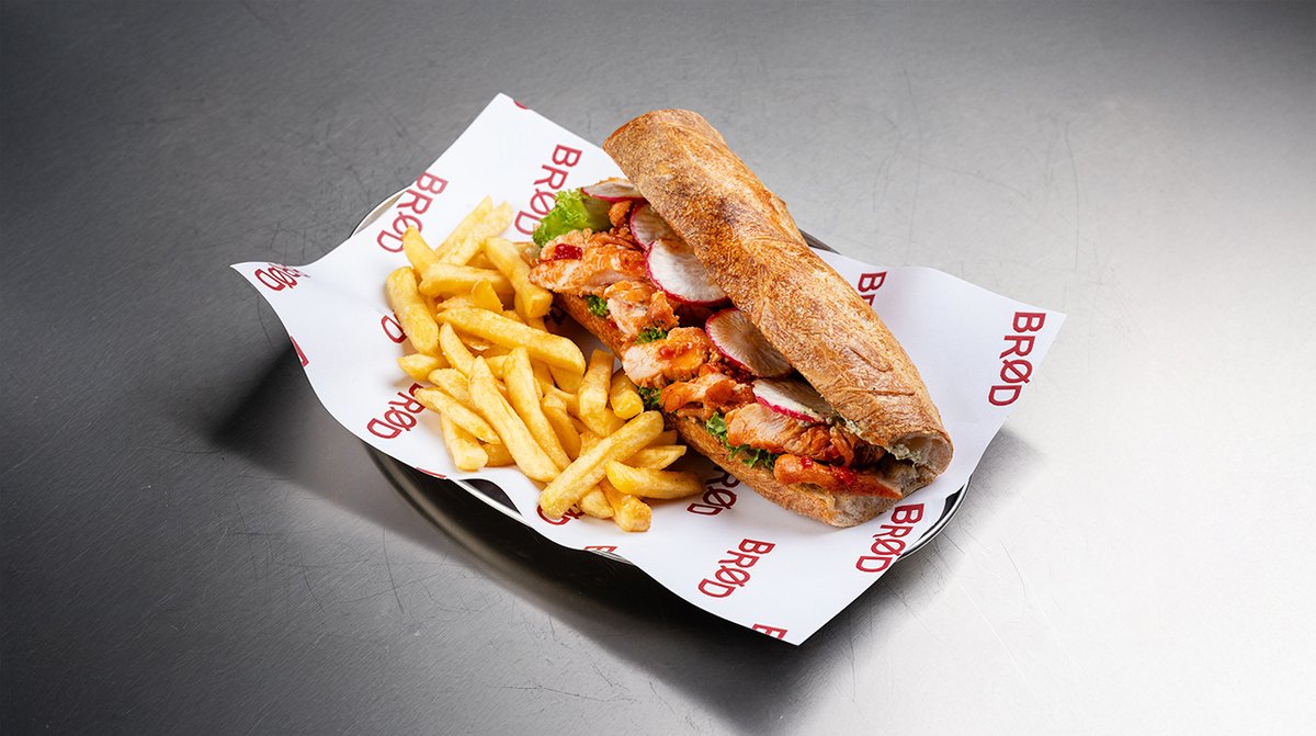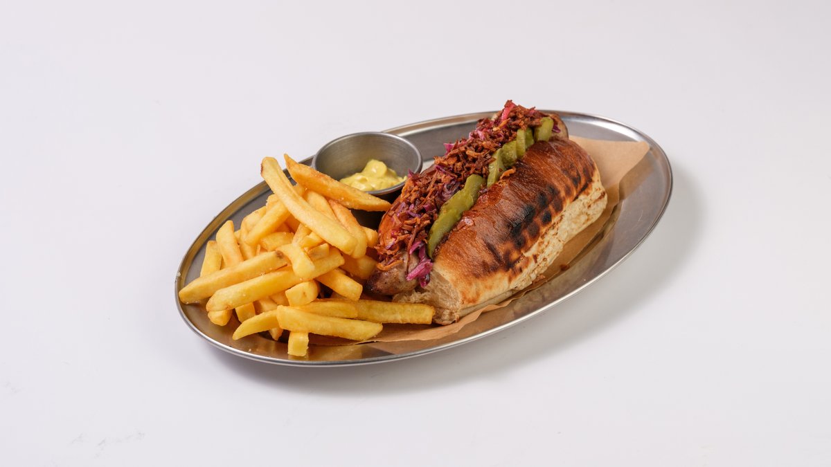 კუპატი, კომბოსტო, მაიო, მდოგვი, კიტრის მარინადი, ხახვის ჩიფსი, კარტოფილი ფრი, ფრანგული ბრიოში