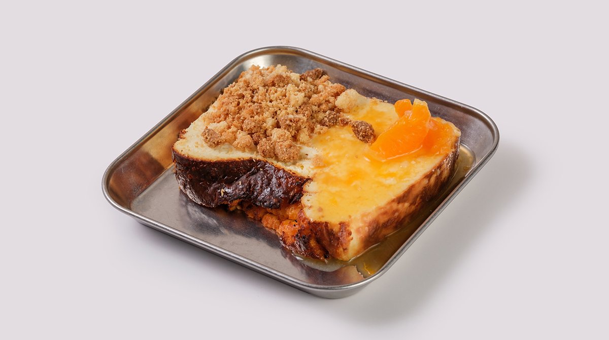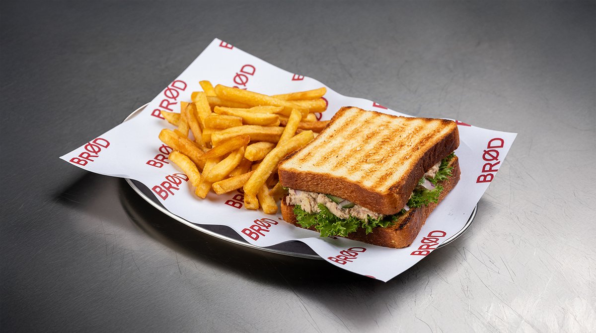 ტუნა, მაიო, კიტრი, წითელი ხახვი, შავი პილპილის მარცვლები, კარტოფილი ფრი, ფრანგული ბრიოში