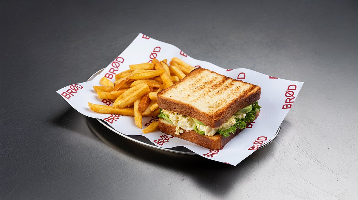 კვერცხი, ავოკადო, მაიო, სალათის ფოთოლი, შავი პილპილის მარცვლები, კარტოფილი ფრი, ფრანგული ბრიოში