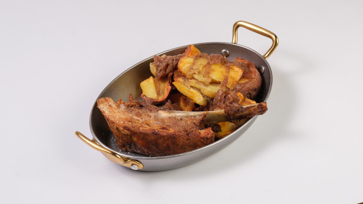 გამომცხვარი დამარინადებული ღორის ნეკნები, კარტოფილი, კარამელიზირებული ხახვი