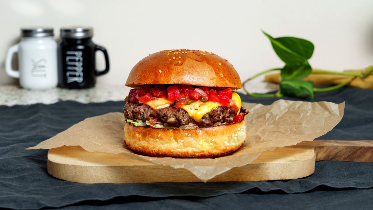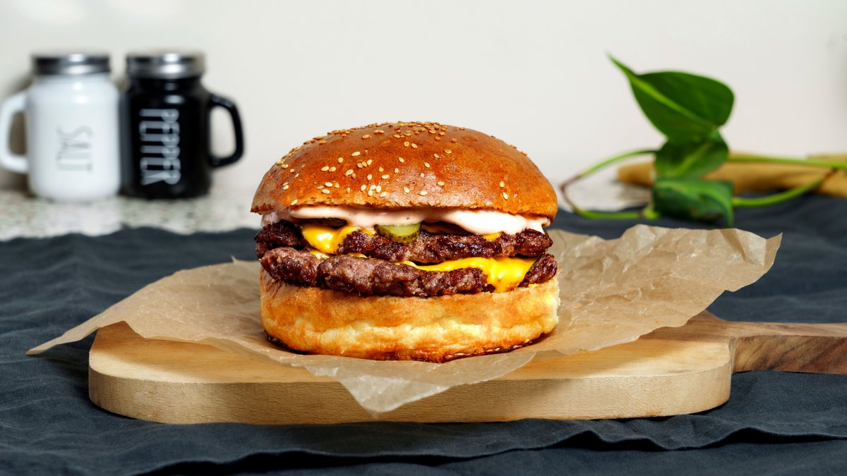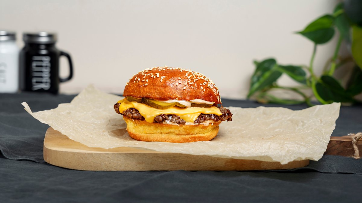 ფუნთუშა, საქონლის ხორცი (2 სმეშ კატლეტი)., საფირმო სოუსი, ხახვი, ყველი ჩედარი, პიკული.