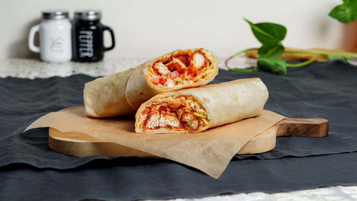 ტორტილა, ქათმის ფილე, ბოსტნეული საფირმო სოუსი, პომიდორი, აისბერგი.