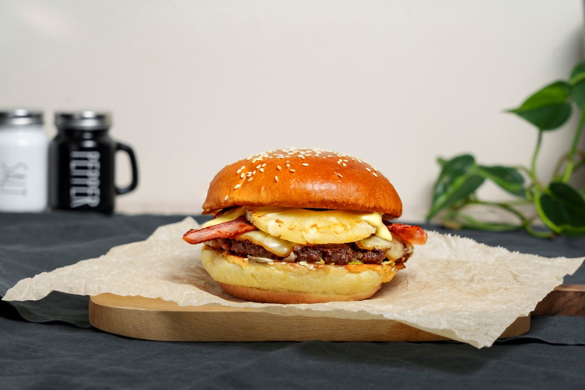 ფუნთუშა, საქონლის კატლეტი, ყველი ჩედარი, ბეკონი, ანანასი, ქარის სოუსი, აისბერგი,