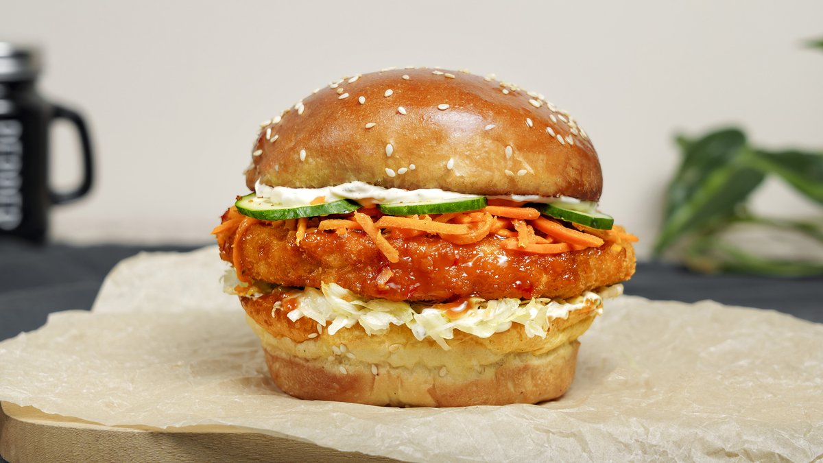 ფუნთუშა, ქათმის ფილე, სტაფილოს წნილი, ბოსტნეული, აისბერგი, საფირმო სოუსი.