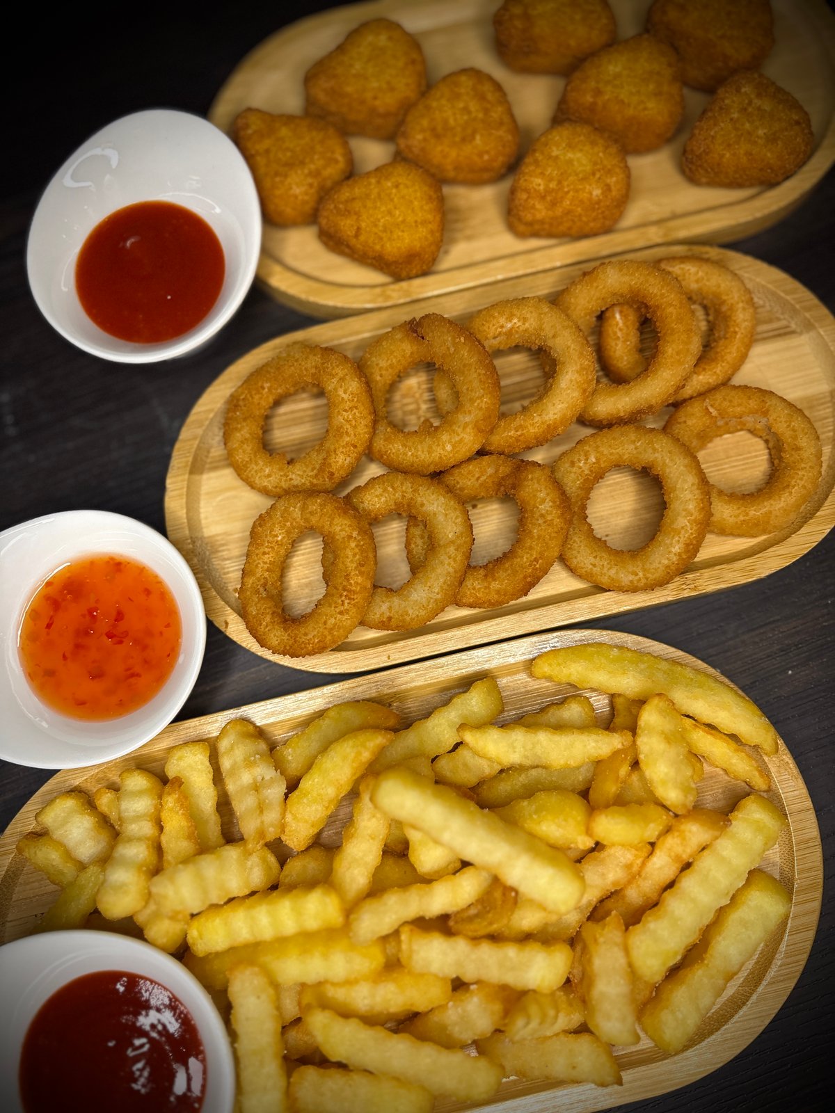 კარტოფილი ფრი,ხახვის რგოლები,ქათმის ნაგეთსები,კეჩუპი