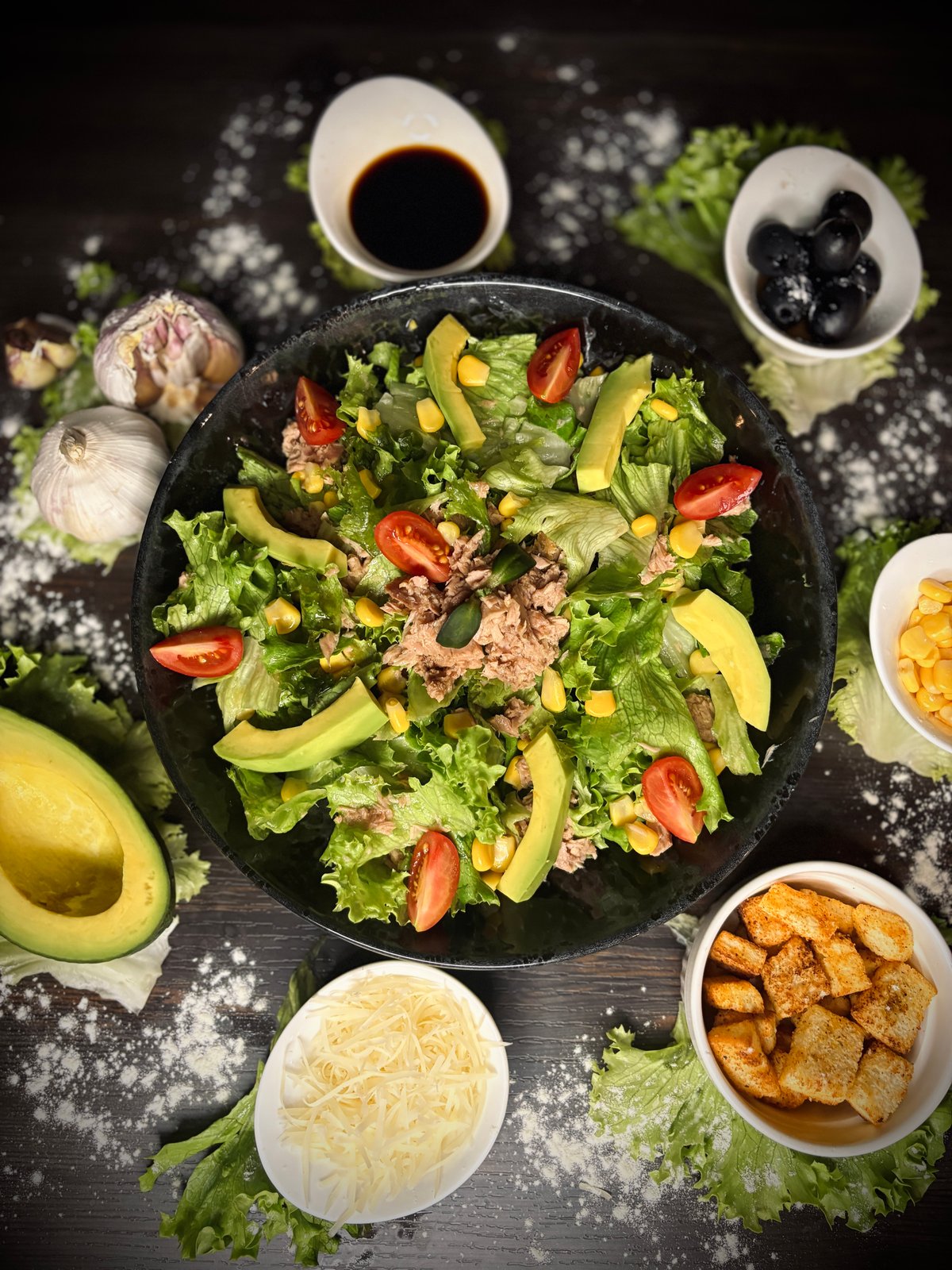 აისბერგი,ჩერი პომიდორი, კიტრი, თინუსის კონსერვი,ავოკადო