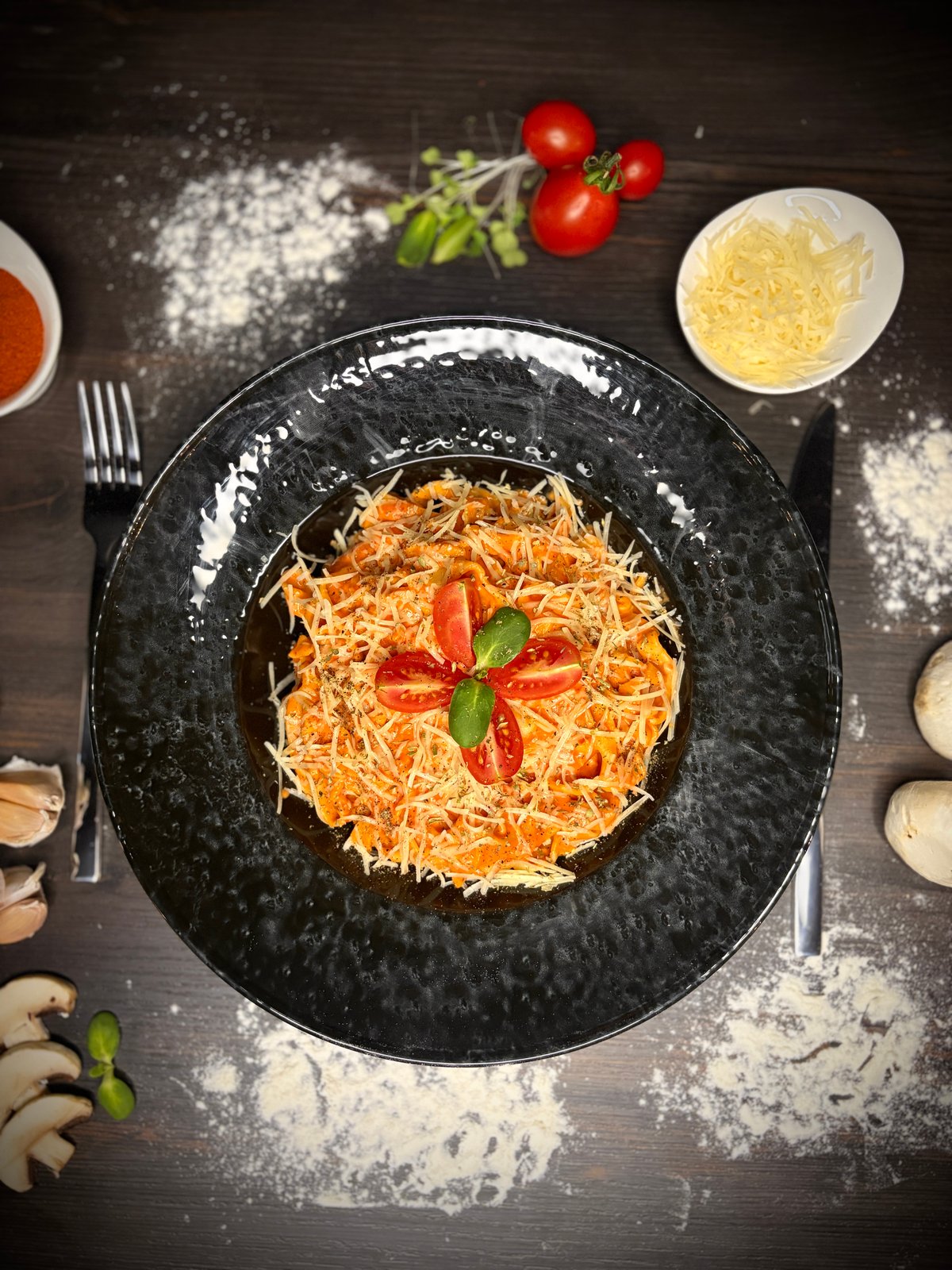 პარმეზანი,მოცარელა,ბლუჩიზი, გაუდა, ნაღები,პილპილი,მარილი,ცომი